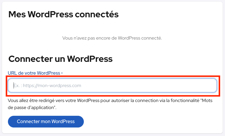 Puis, cliquez sur le bouton "Connecter mon WordPress. Ensuite, vous serez redirigé vers votre compte WordPress pour valider l'association en rentrant vos codes d'accès WordPress.